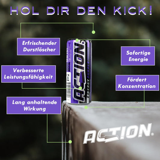 Mit den ACT!ON Energy Drinks bekommst Du 250ml/500ml volle Power. Ob beim Sport, bei der Arbeit oder einfach zwischendurch: Die praktische Dose passt in jede Tasche. So kannst Du überall neue Kraft tanken, um voller Tatendrang durchzustarten!